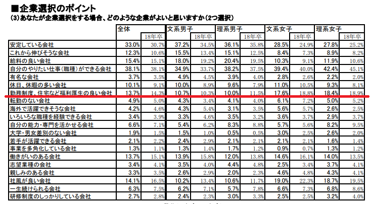 マイナビが2018年に行った「2019年卒マイナビ大学生就職意識調査」の結果によると、女子学生は、企業選択の際、福利厚生の良い会社かどうかが4番目にポイントが高い項目となっています。また男子学生と比較すると、文系男子が10.7%なのに対して文系女子は17.6%、理系男子が10.0%なのに対して理系女子が18.4%と、男性よりも女性の方が重要視していることが分かります。